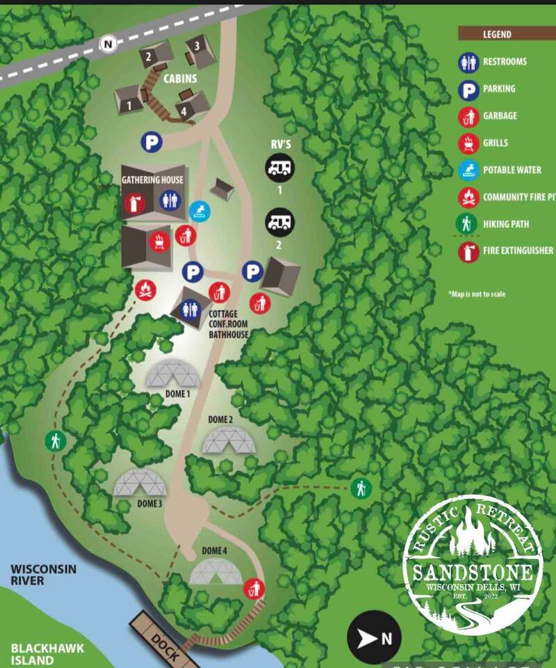 Our property is comprised of 6 acres of land on the Wisconsin River...we have a cornfield to the North, a seasonal cabin to our South the river to the East and a road and natural area to the West. We are 1.8mi from downtown Wisconsin Dells. Our property has 4 cabins, perfect for couples and friends to come to the same place and have their own accommodations, 4 Glamping Domes, 1 cottage with a King bed, a Gathering House (Converted Tavern) social area, that is set up as an intimate and cozy atmosphere (think speakeasy), a 24x24 covered deck and 24x10 patio area. Follow the trail down the hill towards the river and you'll find 225ft of raised walkway through a natural Sandstone canyon that arrives at our private 80ft dock on the riverfront. You'll find excellent walleye, muskie and sturgeon fishing as well as carp and catfish, sheep's head and a bounty of other stuff to catch along with scenery that will make you fall in love... the views from the dock are the crown jewel of the property. We offer a small charcoal grilling station by the cabins and a larger central grilling location by the Gathering House. We have a fire pit in the space beyond the covered deck and plenty of wood to burn on site. Our goal is to host couples, small groups of friends, family or coworkers and provide a space to disconnect from technology, connect with each other, share some unique experiences and make amazing memories you and your loved one/s, you're closest friends or coworkers will look back on for years to come. Maybe Sandstone Rustic Retreat becomes your new getaway tradition! Message us for group rates and special promotions. We can help you curate some amazing experiences! We also offer: Private Bartender for groups of 8 or more(beats an Uber and rambunctious crowds and high priced drinks downtown...and definitely better than a OWI/DUI on the way home) Private Catering/Meal Plan for groups of 10 or more (We have relationships with several catering companies in the area and they will do a meal, a reception or even a private dinner) Kayak Rental ($40 for 4 hours, $50 for the entire day)