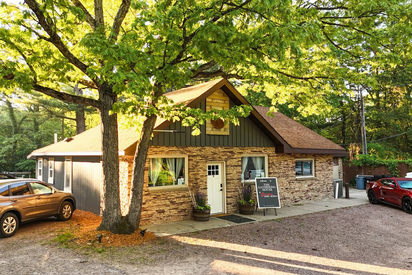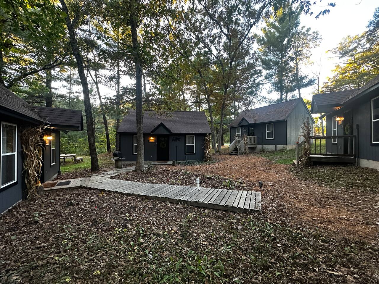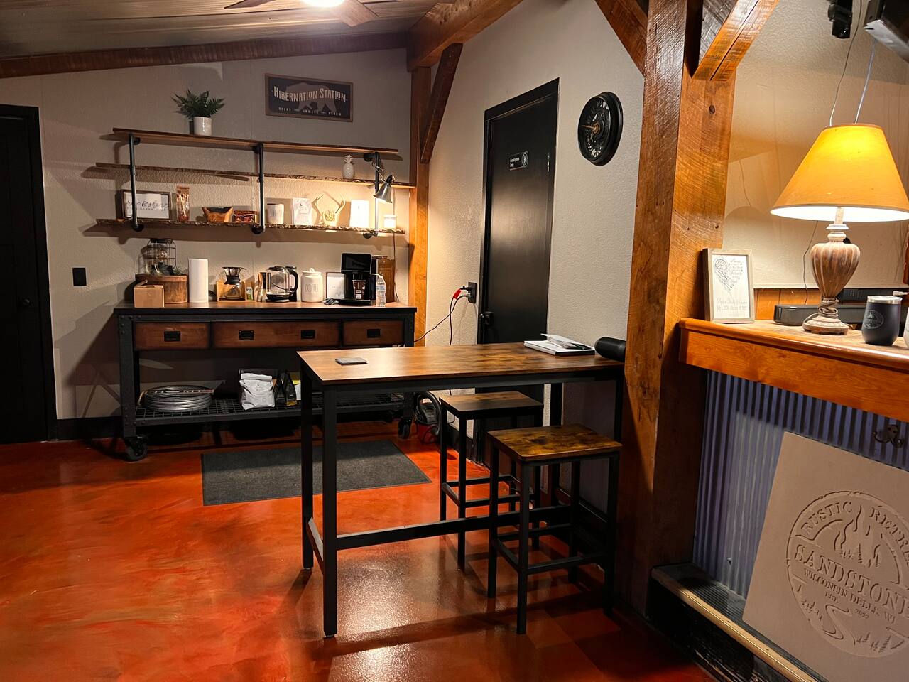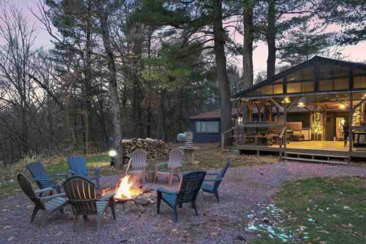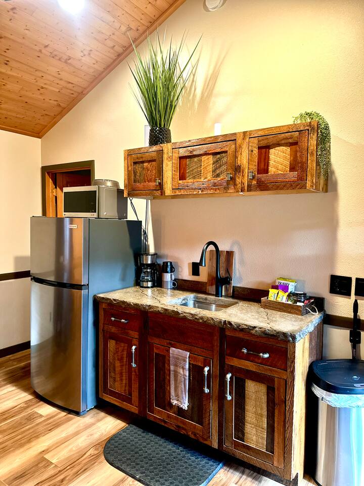 Guests are welcome to explore all six acres of Sandstone Rustic Retreat. The Gathering House (open 6:00am–12:00am) is the heart of the property — a cozy space for coffee at sunrise, conversation by the fire, or unwinding at the end of the day. Alongside espresso and tea, we offer a curated drink menu highlighting local flavors — from Wisconsin Old Fashioneds to regional brews. Beverages are available by request and can be delivered to your cabin or picked up at the bar to enjoy anywhere on the property. Private bar experiences can also be arranged prior to your stay (additional charge). Many mornings, the founders join guests for coffee and conversation, a tradition that makes Sandstone mornings memorable. Outdoors, the covered deck, grilling station, and communal firepit are designed for effortless connection. Propane, utensils, glassware, and dishware are provided — just bring your favorite ingredients and beverages to enjoy a meal under the stars. Trails wind through the pines, and a raised boardwalk leads to our private dock on the Wisconsin River — perfect for sunrise coffee, fishing, or simply taking in the view. Seasonally, the No Wake Zone dock bar welcomes guests and river travelers on summer weekends. In winter, the Gathering House occasionally hosts intimate speakeasy nights — rare, unforgettable evenings you’ll want to experience if your stay aligns.