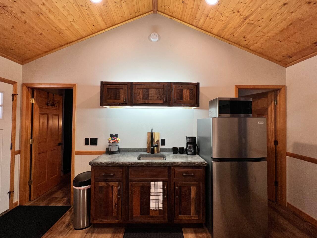 Guests are welcome to explore all six acres of Sandstone Rustic Retreat. The Gathering House (open 6:00am–12:00am) is the heart of the property — a cozy space for coffee at sunrise, conversation by the fire, or unwinding at the end of the day. Alongside espresso and tea, we offer a curated drink menu highlighting local flavors — from Wisconsin Old Fashioneds to regional brews. Beverages are available by request and can be delivered to your cabin or picked up at the bar to enjoy anywhere on the property. Private bar experiences can also be arranged prior to your stay (additional charge). Many mornings, the founders join guests for coffee and conversation, a tradition that makes Sandstone mornings memorable. Outdoors, the covered deck, grilling station, and communal firepit are designed for effortless connection. Propane, utensils, glassware, and dishware are provided — just bring your favorite ingredients and beverages to enjoy a meal under the stars. Trails wind through the pines, and a raised boardwalk leads to our private dock on the Wisconsin River — perfect for sunrise coffee, fishing, or simply taking in the view. Seasonally, the No Wake Zone dock bar welcomes guests and river travelers on summer weekends. In winter, the Gathering House occasionally hosts intimate speakeasy nights — rare, unforgettable evenings you’ll want to experience if your stay aligns.