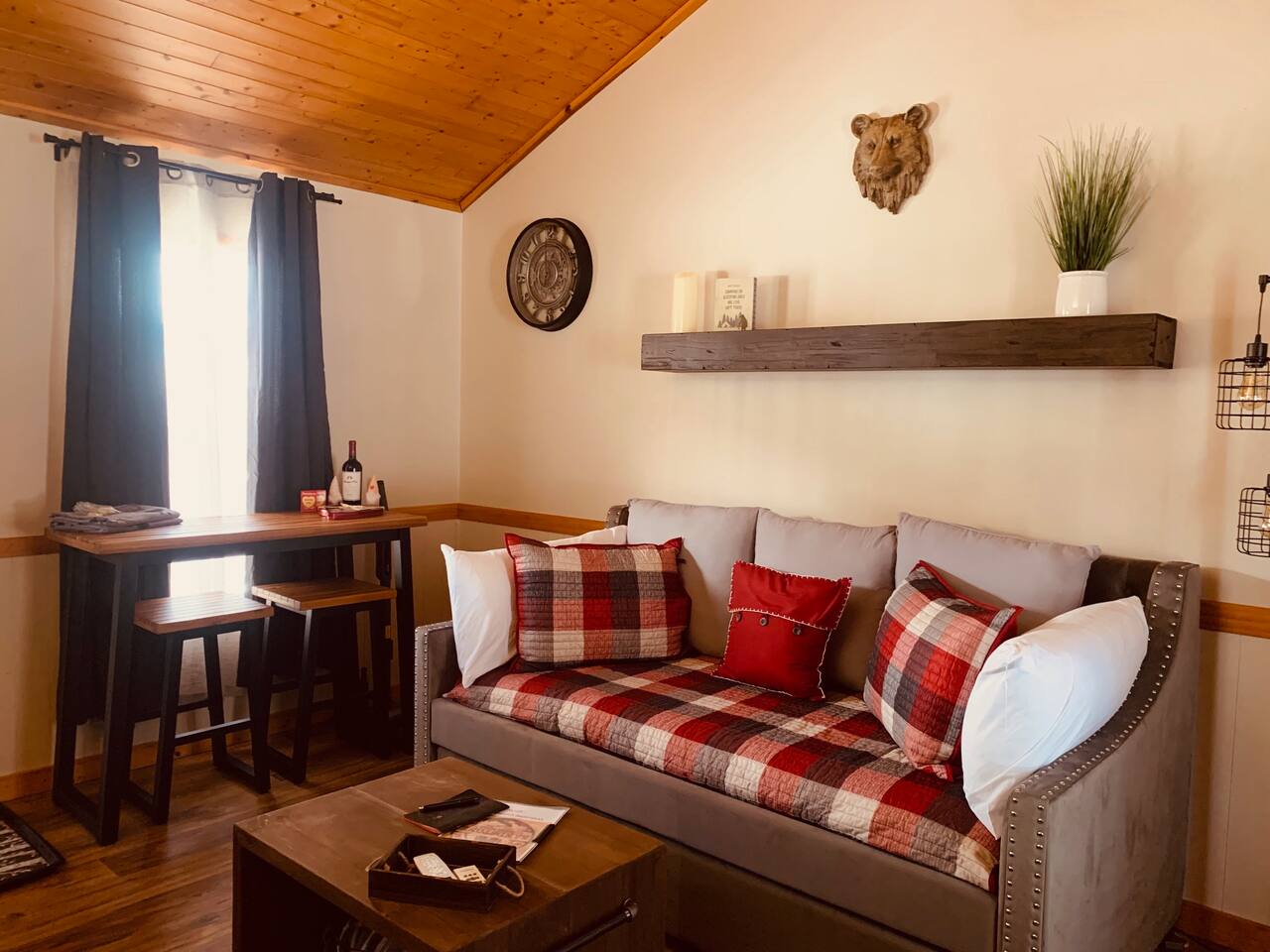 Welcome to Sandstone Rustic Retreat, a boutique destination designed for couples who value connection, quiet, and something truly different in the Wisconsin Dells. Just 1.8 miles from downtown, yet worlds away from the crowds, our six-acre property offers more stars, less people — an intentional space to unplug and rediscover what matters most. Our retreat features four thoughtfully remodeled cabins (each designed for couples), a cozy studio cottage, and four unique glamping domes. Every space blends rustic charm with modern comfort, giving you privacy while inviting you to explore the property together. At the heart of Sandstone is the Gathering House — a converted tavern now serving as a cozy community space with coffee, espresso, tea, WiFi, games, and fireside seating. Step outside to a covered deck, grilling area, and communal firepit perfect for conversations under the stars. In summer, our No Wake Zone dock bar welcomes river travelers on weekends, and in winter, the Gathering House transforms into an intimate speakeasy night a few times a month — a rare and unforgettable experience if your stay aligns. Wander the trails through whispering pines, follow our raised boardwalk through a sandstone canyon, and emerge at the crown jewel: a private dock on the quiet backwaters of the Wisconsin River. Here you’ll find breathtaking views, excellent fishing, and the kind of peaceful beauty you won’t find in town. More than a place to stay, Sandstone is a place to experience. Whether you’re sipping wine in a dome, sharing coffee on the deck, paddling the river in a kayak, or gathering friends for a private meal, every detail has been designed to help you slow down, reconnect, and create lasting memories.