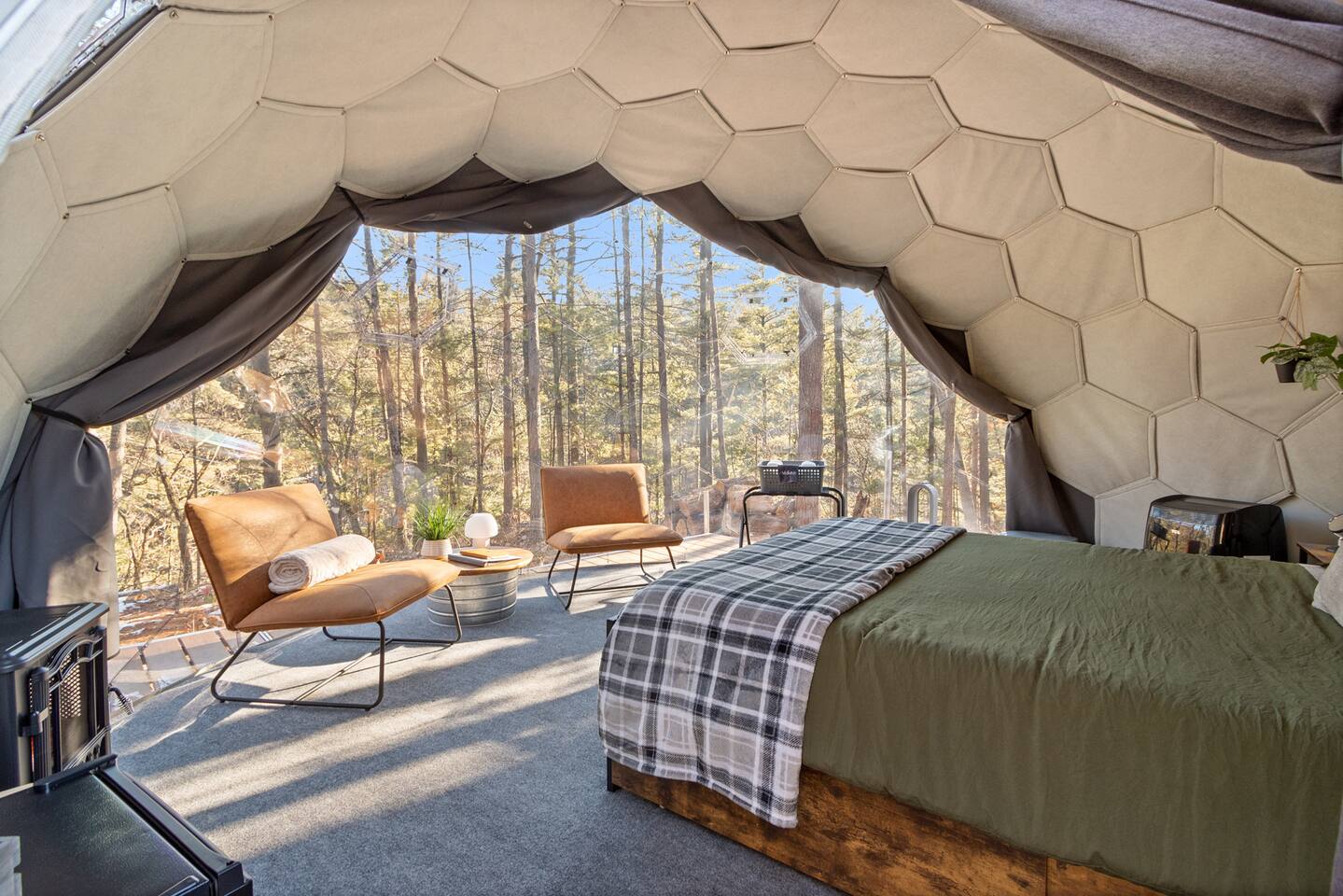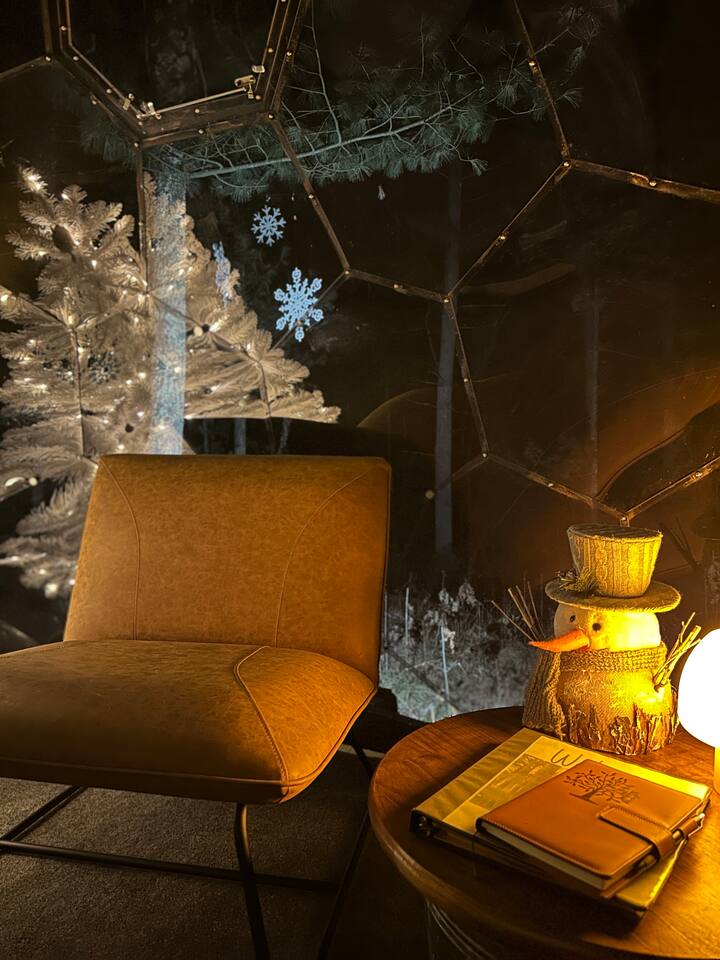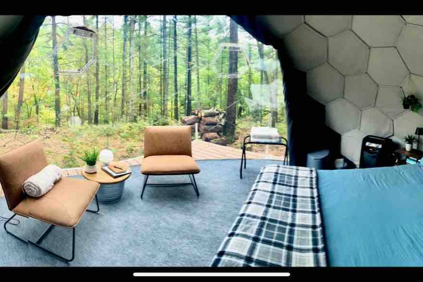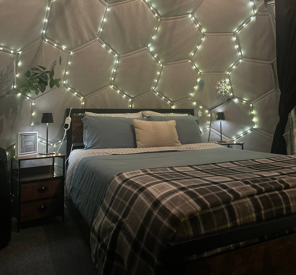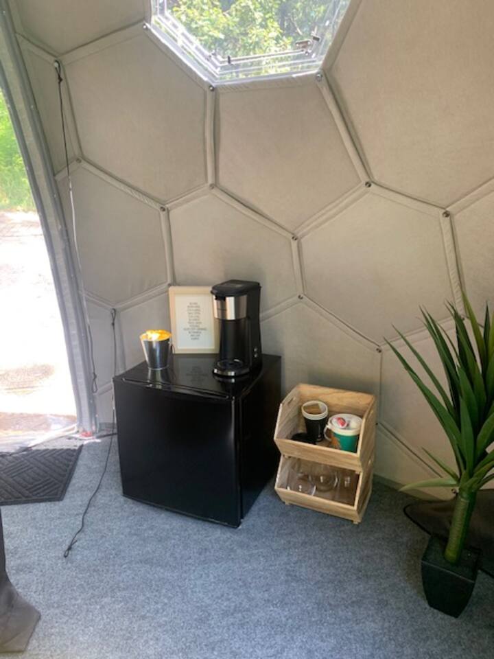 Staying in a dome amidst nature is a unique experience. The circular structure offers an amazing view of the surroundings, with peaceful sounds of rustling leaves, chirping birds, and a flowing river below. The cozy dome has a queen size bed, night stands, a seating area, mini fridge, and a k-cup coffee maker & heater/ac. At night, the starry sky and nature's sounds lull you to sleep. Waking up, you feel refreshed, and the peaceful surroundings and breathtaking views leave a lasting impression.