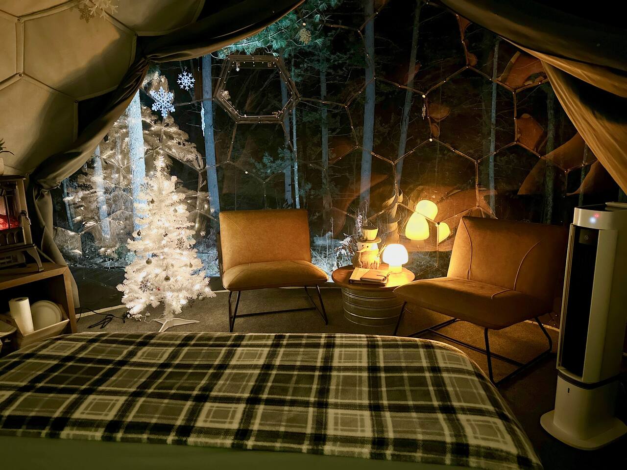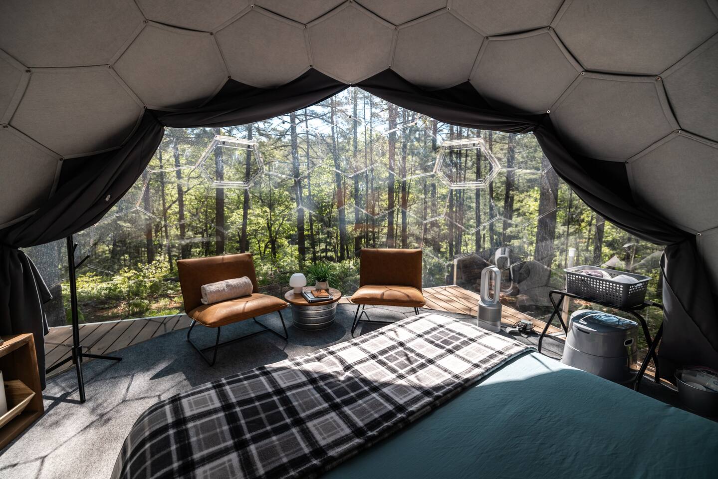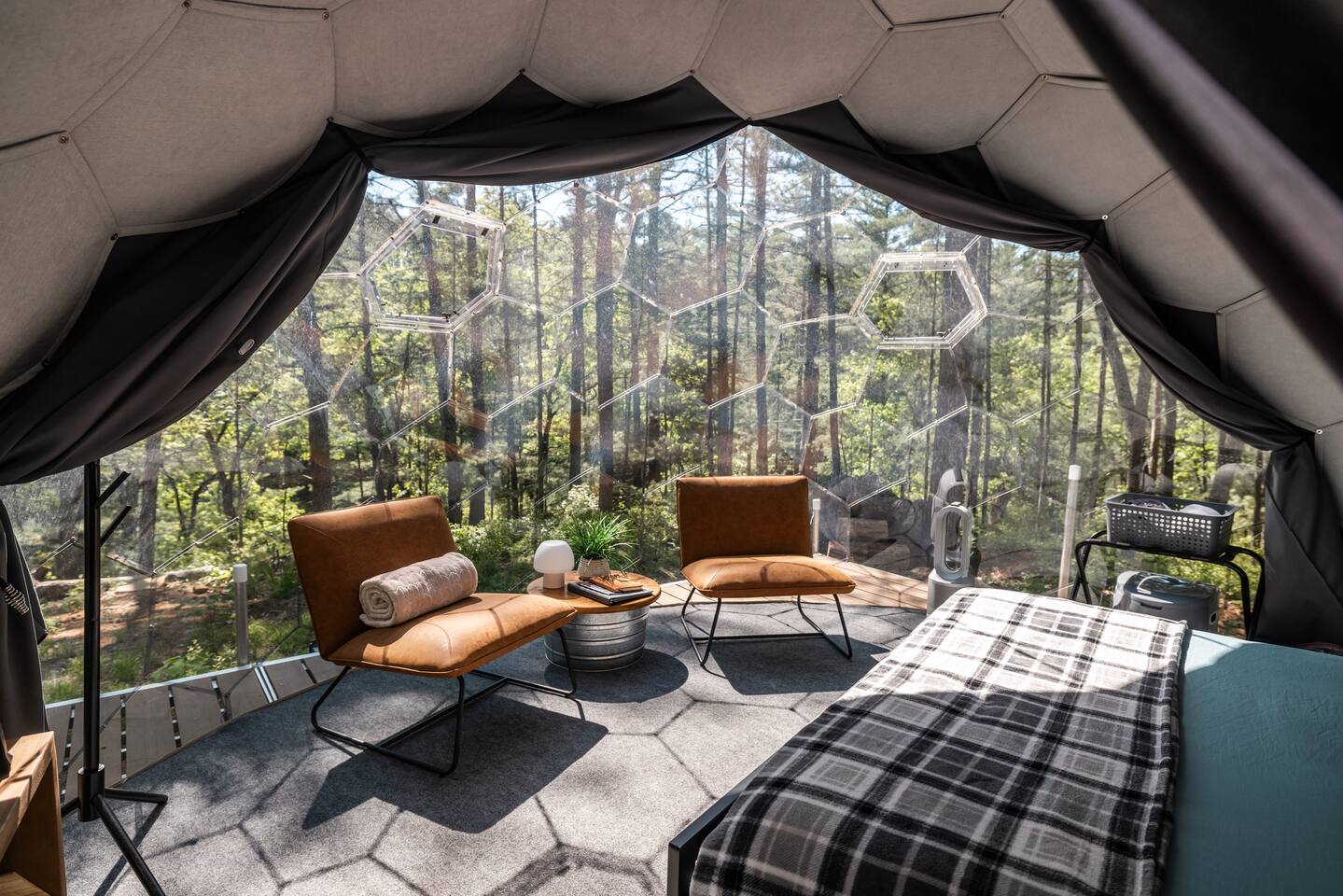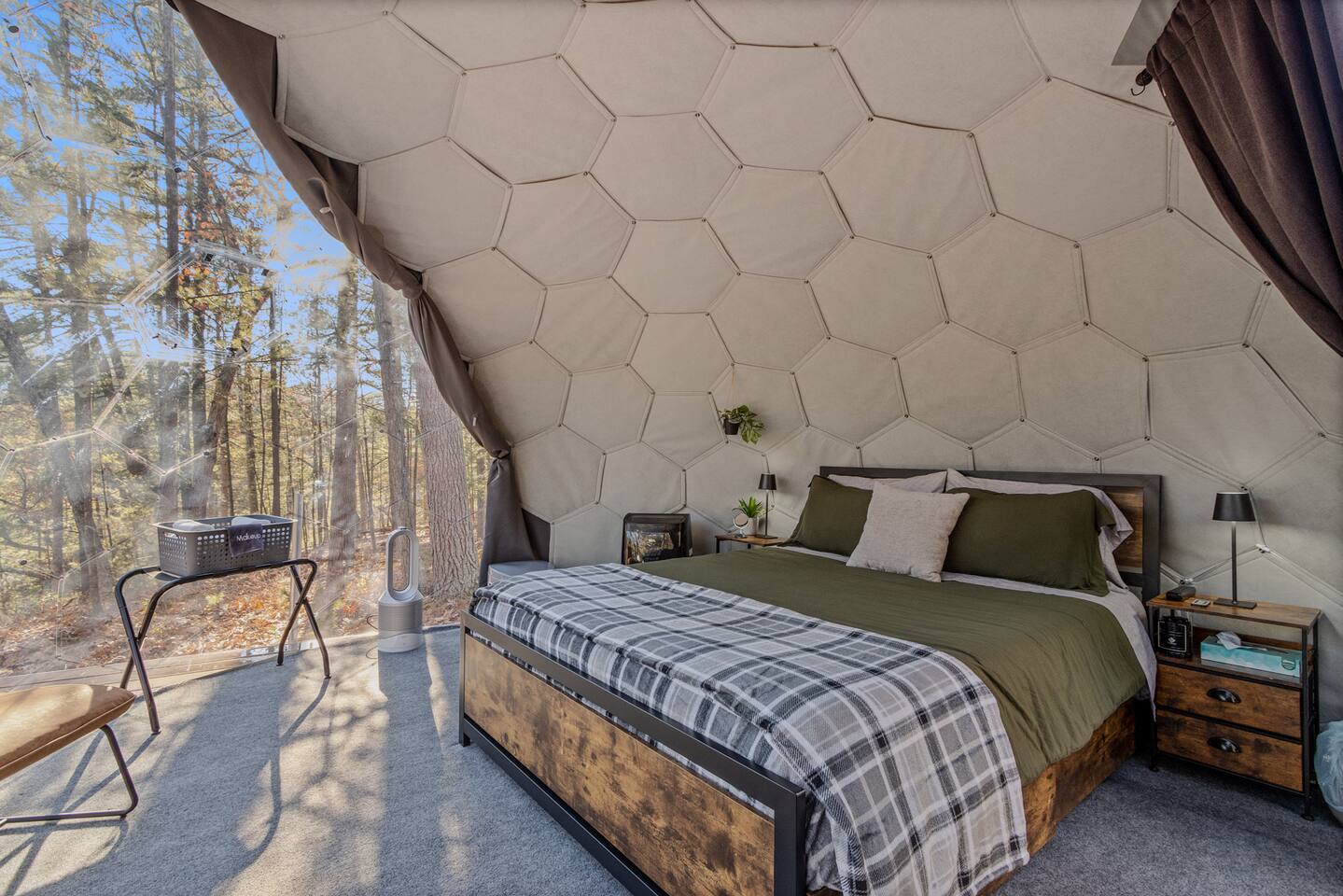 Staying in a dome amidst nature is a unique experience. The circular structure offers an amazing view of the surroundings, with peaceful sounds of rustling leaves, chirping birds, and a flowing river below. The cozy dome has a queen size bed, night stands, a seating area, mini fridge, and a k-cup coffee maker & heater/ac. At night, the starry sky and nature's sounds lull you to sleep. Waking up, you feel refreshed, and the peaceful surroundings and breathtaking views leave a lasting impression.
