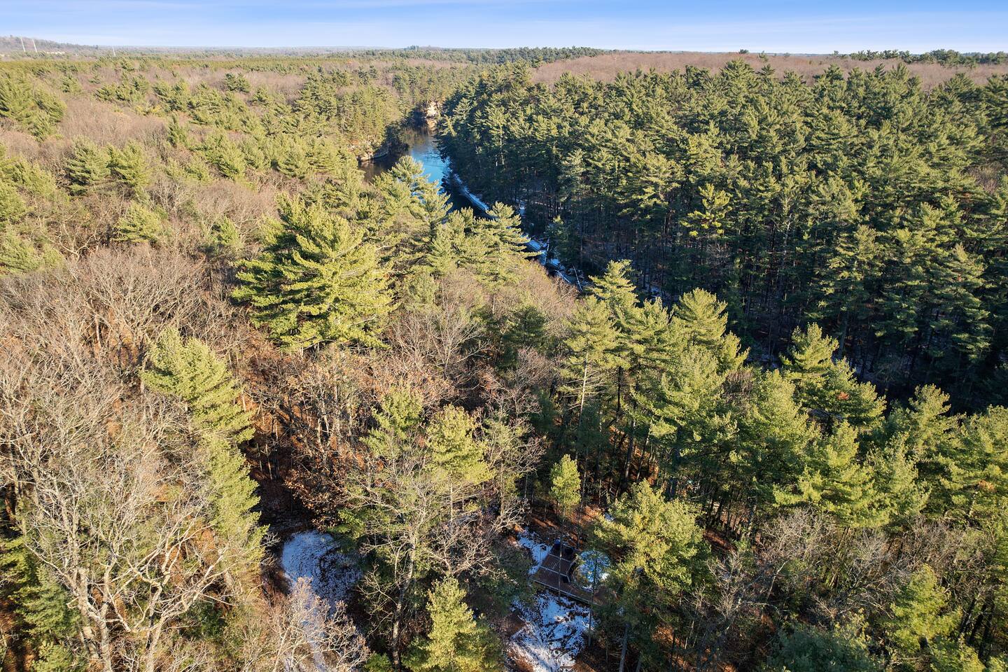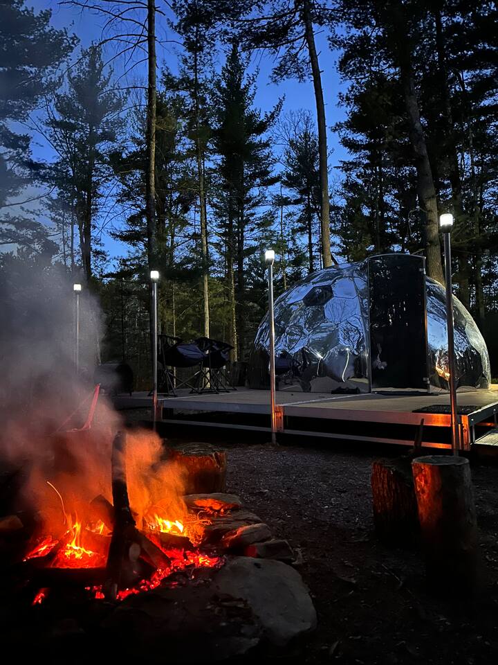 THE DOME EXPERIENCE Staying in a dome immersed in nature is an experience like no other. As you step inside the dome, you are immediately greeted with the feeling of warmth and comfort as you look out to the breathtaking views of the sandstone cliffside and the flowing river. The dome itself is cozy and inviting, with all the amenities you need for a comfortable stay. A comfortable bed, nightstands, a seating area and a "Dome-a-Loo" (a portable toilet) are all thoughtfully arranged within the dome's circular walls. The dome is elevated on a wooden platform and just outside your door you have a private fire pit and chairs to enjoy a warm fire and relax with a beverage. As night falls, the dome takes on a magical quality. The sun casts a warm, golden glow over the landscape, creating a sense of calm and tranquility. The starry sky is visible through the dome's clear panels, and the peaceful sounds of nature continue to lull you into a deep sleep. ***This dome is located the furthest from the main building (600 feet). ***UPDATE: We are now fully hooked up to electricity so no more worrying about the generator. Also please keep in mind that this is a glamping experience, not a hotel experience. You may experience a few bugs, small animals and some dirt. If you are okay with all of those things then book your stay! We are excited to host you! OUR PROPERTY Our property is comprised of 6ac of land on the Wisconsin River...we have a cornfield to the North, a seasonal cabin to our South the river to the East and a road and natural area to the West. We are 1.8mi from downtown Wisconsin Dells. Our property also has 4 cabins, perfect for couples and friends to come to the same place and have their own accommodations, a Gathering House (Converted Tavern) social area, that is set up as an intimate and cozy atmosphere (think speakeasy), a 24x24 covered deck and 24x10 patio area. Follow the trail down the hill towards the river and you'll find 225ft of raised walkway through a natural Sandstone canyon that arrives at our private 80ft dock on the riverfront. You'll find excellent walleye, muskie and sturgeon fishing as well as carp and catfish sheep's head and a bounty of other stuff to catch along with scenery that will make you fall in love... The views from the dock are the crown jewel of the property. We offer a central grilling location by the Gathering House. We have a fire pit in the space beyond the covered deck and plenty of wood to burn on site. Our goal is to host couples, small groups of friends, family or coworkers and provide a space to disconnect from technology, connect with each other, share some unique experiences and make amazing memories you and your loved one/s, you're closest friends or coworkers will look back on for years to come. Maybe Sandstone Rustic Retreat becomes your new getaway tradition! Message us for group rates and special promotions as well as packages for area attractions. We can help you curate some amazing experiences! FOR SMALL GROUPS (10 or more) WE ALSO OFFER: -Private Bartender (beats an Uber and rambunctious crowds and high priced drinks downtown...and definitely better than a OWI/DUI on the way home) -Private Catering (We have relationships with several catering companies in the area and they will do a meal, a reception or even a private dinner) GET ON THE WATER! -Kayak Rentals: $40/4 hrs or $50 for the day. We have inflatable Bote kayaks that are very stable and comfortable to paddle in. There are a number of amazing rock formations and breathtaking scenery right up river from our private dock. If you are looking to hang out on a sandbar or small beach there are plenty of those to paddle to not far from our property. Pack a lunch and some cold beverages and enjoy your day!