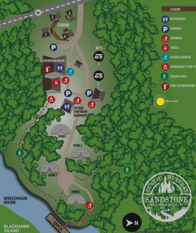Escape to our serene 6-acre retreat on the Wisconsin River, featuring 4 cozy cabins, 4 unique glamping domes, and a charming studio cottage. Gather in our welcoming Gathering House for shared moments and memories, enjoy our private dock, kayaks and nearby trails. Ideal for families or group getaways, our hidden gem offers seclusion near Dells' attractions. Plan your dream event—weddings, reunions, or wellness retreats. Unplug, unwind, and discover tranquility amidst nature's embrace.