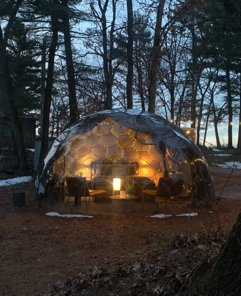 THE DOME EXPERIENCE Staying in a dome immersed in nature is an experience like no other. As you step inside the dome, you are immediately greeted with the feeling of warmth and comfort as you look out to the breathtaking views of nature. The dome itself is cozy and inviting, with all the amenities you need for a comfortable stay. A comfortable bed, nightstands, a seating area, small refrigerator, coffee maker and a "Dome-a-Loo"(portable toilet) are all thoughtfully arranged within the dome's circular walls. This dome is set at ground level and just outside your door you have a private fire pit and chairs to enjoy a warm fire and relax with a beverage. Your full size bathroom is just a short walk up the pathway. As night falls, the dome takes on a magical quality. The sun casts a warm, golden glow over the landscape, creating a sense of calm and tranquility. The starry sky is visible through the dome's clear panels, and the peaceful sounds of nature continue to lull you into a deep sleep. **Please keep in mind, this is a glamping experience not a hotel experience. You may encounter some bugs, small animals, and some dirt. If you are okay with that then book your stay! We can't wait to host you. OUR PROPERTY Our property is comprised of 6ac of land on the Wisconsin River...we have a cornfield to the North, a seasonal cabin to our South the river to the East and a road and natural area to the West. We are 1.8mi from downtown Wisconsin Dells. Our property also has 4 cabins and a studio cottage, perfect for couples and friends to come to the same place and have their own accommodations, a Gathering House (Converted Tavern) social area, that is set up as an intimate and cozy atmosphere (think speakeasy), a 24x24 covered deck and 24x10 patio area. Follow the trail down the hill towards the river and you'll find 225ft of raised walkway through a natural Sandstone canyon that arrives at our private 80ft dock on the riverfront. You'll find excellent walleye, muskie and sturgeon fishing as well as carp and catfish, sheep's head and a bounty of other stuff to catch along with scenery that will make you fall in love... The views from the dock are the crown jewel of the property. We offer a central charcoal grilling location by the Gathering House. We have a fire pit in the space beyond the covered deck and plenty of wood to burn on site. Our goal is to host couples, small groups of friends, family or coworkers and provide a space to disconnect from technology, connect with each other, share some unique experiences and make amazing memories you and your loved one/s, you're closest friends or coworkers will look back on for years to come. Maybe Sandstone Rustic Retreat becomes your new getaway tradition! Message us for group rates and special promotions as well recommendations for area attractions. We can help you curate some amazing experiences! For small groups (10 0r more) we also offer: -Private Bartender (beats an Uber and rambunctious crowds and high priced drinks downtown...and definitely better than a OWI/DUI on the way home) -Private Catering (We have relationships with several catering companies in the area and they will do a meal, a reception or even a private dinner) Get on the Water! -Kayak Rentals: $40/4 hrs or $50 for the day. We have inflatable Bote kayaks that are very stable and comfortable to paddle in. There are a number of amazing rock formations and breathtaking scenery right up river from our private dock. If you are looking to hang out on a sandbar or small beach there are plenty of those to paddle to not far from our property. Pack a lunch and some cold beverages and enjoy your day! Hike the North Shore Trail! Discover a scenic 2-mile hiking trail just steps from our property! This marked, ungroomed trail takes you on a stunning journey through a small canyon, past a hidden cave, and along the tranquil river. Traverse over and under large trees while soaking in the natural beauty around you. Along the way, you’ll find the perfect spots to enjoy a picnic or unwind with a good book in the peaceful, wooded setting by the river.